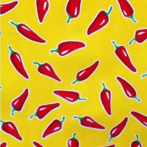 Proefstaaltje: Mexicaans tafelzeil rode pepers op geel € 1,89