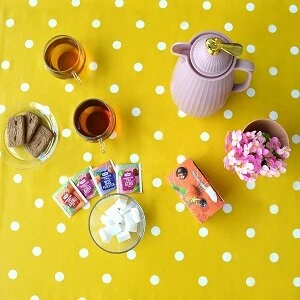 Proefstaaltje: Tafelzeil stippen geel € 1,89